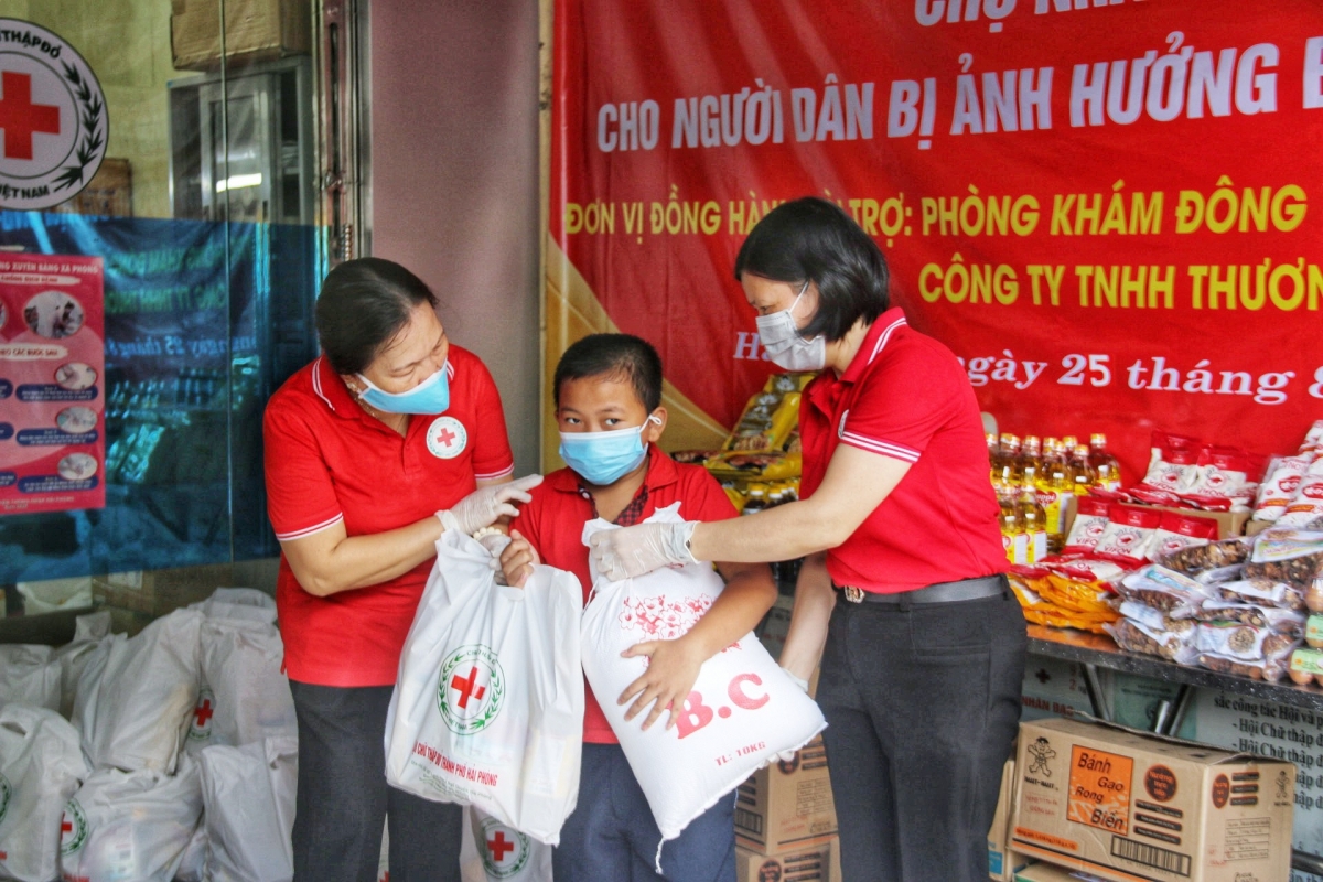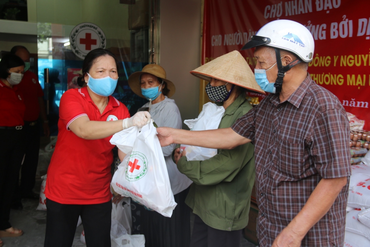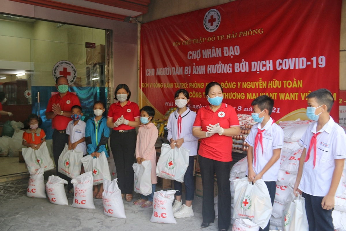 Tại Chợ Nhân đạo, Hội Chữ thập đỏ thành phố đã trao tặng 205 suất hàng là các nhu yếu phẩm thiết yếu như: gạo, dầu ăn, bột canh, bột ngọt, nước mắm, bánh, trứng gà, nấm hương, mộc nhĩ… cho các em học sinh là trẻ mồ côi, người già cô đơn không nơi nương tựa, người dân có hoàn cảnh khó khăn do dịch Covid-19 của các quận: Dương Kinh, Hải An, Ngô Quyền, Hồng Bàng và Kiến An. Mỗi suất hàng trị giá 300 ngàn đồng, tổng giá trị trao tặng là 62 triệu đồng.