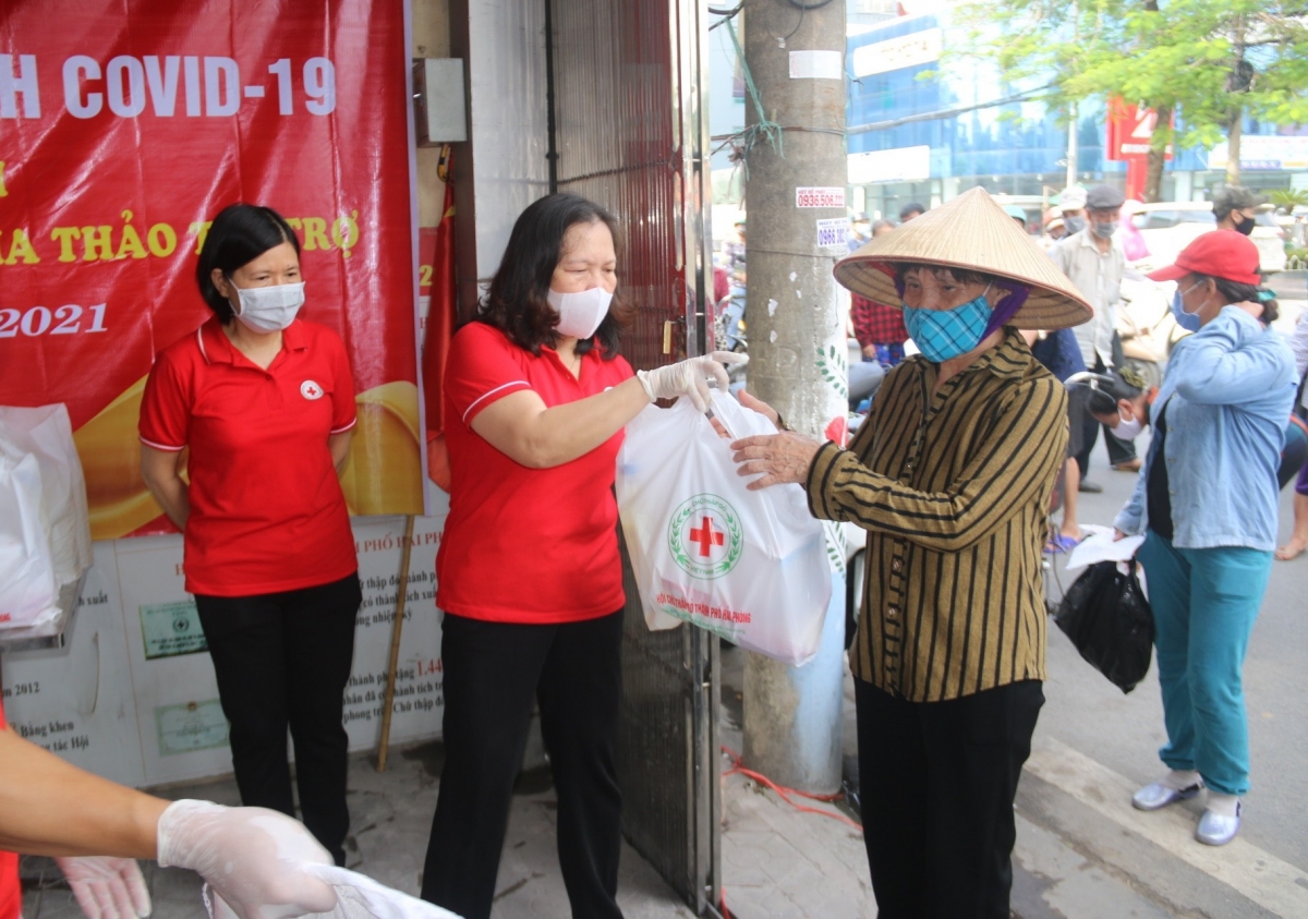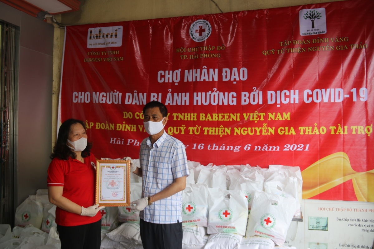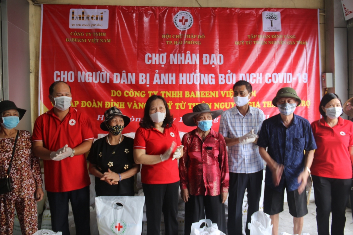 Tiếp tục các hoạt động hỗ trợ người dân có hoàn cảnh khó khăn bị ảnh hưởng bởi dịch Covid-19, sáng ngày 16/6, Hội Chữ thập đỏ thành phố đã tổ chức chương trình Chợ Nhân đạo phát 60 suất hàng miễn phí cho người dân trên địa bàn quận Lê Chân, Hồng Bàng do công ty TNHH Babeeni Việt Nam và Tập đoàn Đỉnh Vàng - Quỹ từ thiện Nguyễn Gia Thảo tài trợ. Dự và phát hàng tại chợ nhân đạo có bà Cao Thị Phượng - UVBCH Trung ương Hội CTĐ Việt Nam, Chủ tịch Hội Chữ thập đỏ thành phố, ông Lê Huy Hoà - Phó Giám đốc Công ty TNHH Babeeni Việt Nam, các ông bà thường trực Hội Chữ thập đỏ thành phố và quận Lê Chân, Hồng Bàng.
