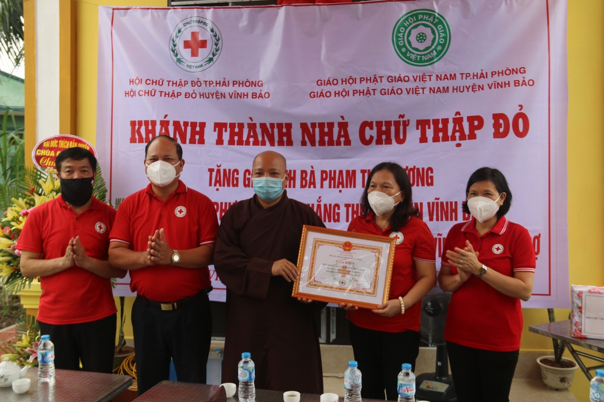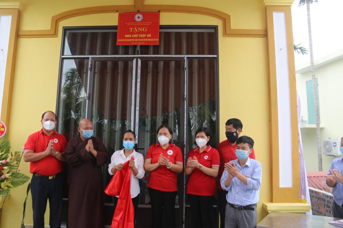 Thực hiện chương trình phối hợp giữa Hội Chữ thập đỏ và Ban Trị sự Giáo hội PGVN thành phố, sáng ngày 13/8, tại huyện Vĩnh Bảo, Hội Chữ thập đỏ thành phố đã tổ chức khánh thành 02 Nhà Chữ thập đỏ cho người dân có hoàn cảnh khó khăn. Dự buổi khánh thành có bà Cao Thị Phượng – UVBCH Trung ương Hội CTĐ Việt Nam, Chủ tịch Hội Chữ thập đỏ thành phố; các ông bà Thường trực Hội Chữ thập đỏ thành phố và huyện Vĩnh Bảo; Đại Đức Thích Bản Quyền – Trưởng ban Trị Giáo hội PGVN huyện Vĩnh Bảo, lãnh đạo xã Thắng Thủy, xã Hòa Bình và đại diện gia đình, dòng họ của 02 gia đình được hỗ trợ xây nhà Chữ thập đỏ.